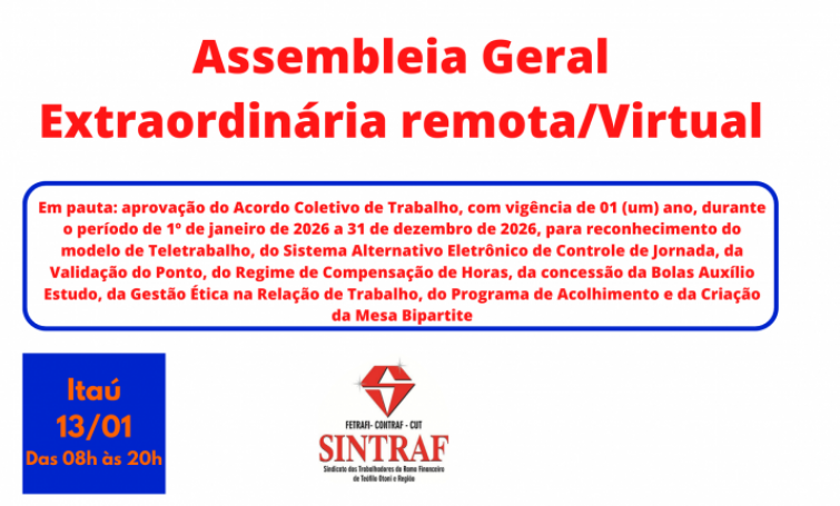 Edital: Sindicato convoca bancários do Itaú para assembleia nesta terça-feira (13/01)