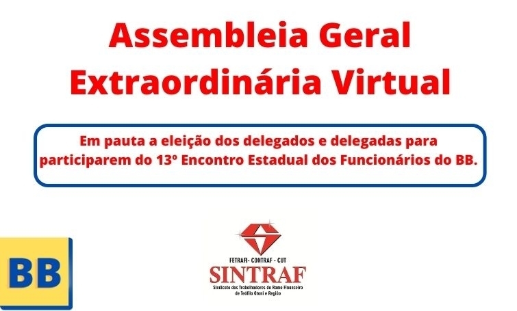 Assembleia será realizada de forma remota/virtual pelo aplicativo Google Meet. Pauta será a eleição dos delegados e delegadas para participarem do 13º Encontro Estadual dos Funcionários do BB.