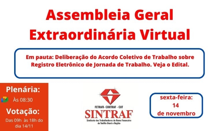 Assembleia será realizada de forma remota/virtual, das 09h até as 18h desta sexta-feira (14), e irá deliberar sobre o Acordo Coletivo de Trabalho sobre Registro Eletrônico de Jornada de Trabalho. A assembleia será precedida de uma plenária remota/virtual, às 08:30h.