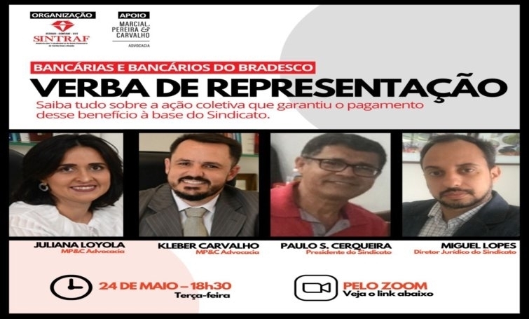 No encontro virtual, a Dra. Juliana Loyola e o Dr. Kleber Carvalho, do Escritório Marcial, Pereira & Carvalho, irão esclarecer todas as dúvidas referentes à ação coletiva ajuizada pelo Sindicato em face do Banco Bradesco, em que foi reconhecido o direito ao pagamento da parcela Verba de Representação.