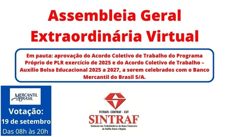 Em pauta a deliberação acerca da aprovação do Acordo Coletivo de Trabalho do Programa Próprio de PLR exercício de 2025 e do Acordo Coletivo de Trabalho – Auxílio Bolsa Educacional 2025 a 2027, a serem celebrados com o Banco Mercantil do Brasil S/A.