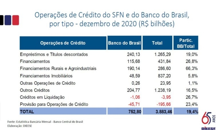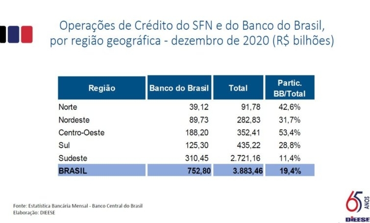 A apresentação da economista Nádia Vieira de Souza, do Departamento Intersindical de Estatística e Estudos Socioeconômicos (Dieese) reforçou a visão de que o Banco do Brasil, assim como os demais bancos públicos, desempenha um importante papel no desenvolvimento do país, tanto em decorrência da concessão de crédito, principalmente no crédito rural, mas também na execução de programas sociais do Governo Federal. ??Mas, nos últimos anos, temos visto um ataque sistemático a todos os bancos públicos, incluindo o Banco do Brasil. Isso tem reduzido cada vez mais sua atuação?, observou a economista. ??Mas, mesmo com esses ataques, a participação do BB no total de crédito fechou 2020 em 19,4%, com peso ainda maior nas regiões Norte, Nordeste e Centro-Oeste?, completou.