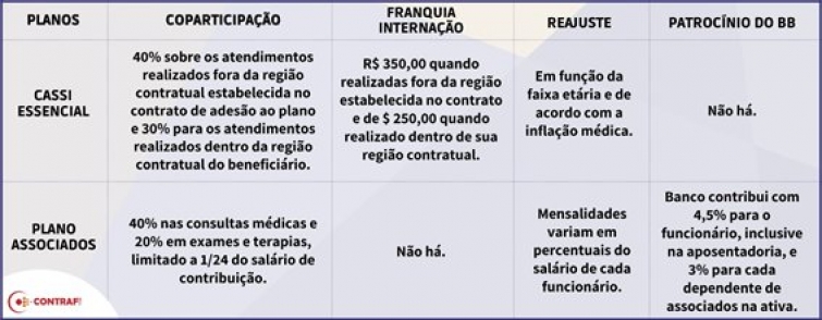 Veja a seguir uma tabela com as principais diferenças entre o Cassi Essencial e o Plano Associados. Com as taxas de franquia e coparticipação, o Cassi Essencial tende a se tornar mais caro para o bolso do participante, ao longo do tempo e da necessidade de utilização dos serviços de saúde.
