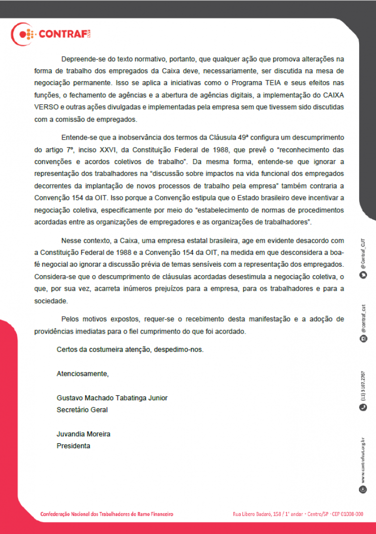 A Contraf-CUT ainda observa que “a inobservância dos termos da Cláusula 49 configura um descumprimento do artigo 7º, inciso XXVI, da Constituição Federal de 1988, que prevê o ‘reconhecimento das convenções e acordos coletivos de trabalho’. Da mesma forma, entende-se que ignorar a representação dos trabalhadores na ‘discussão sobre impactos na vida funcional dos empregados decorrentes da implantação de novos processos de trabalho pela empresa’ também contraria a Convenção 154 da OIT. Isso porque a Convenção estipula que o Estado brasileiro deve incentivar a negociação coletiva, especificamente por meio do ‘estabelecimento de normas de procedimentos acordadas entre as organizações de empregadores e as organizações de trabalhadores’.”