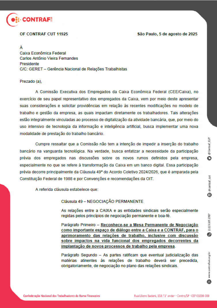 No ofício, a Contraf-CUT apresenta suas considerações e solicita “providências em relação às recentes modificações no modelo de trabalho e gestão da empresa, as quais impactam diretamente os trabalhadores.” O texto ressalta ainda que “tais alterações estão integralmente vinculadas ao processo de digitalização da atividade bancária, que, por meio do uso intensivo de tecnologia da informação e inteligência artificial, busca implementar uma nova modalidade de prestação do trabalho bancário.”