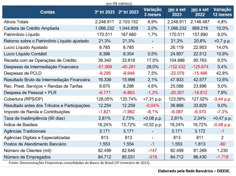 O Banco do Brasil apresentou, nesta quinta-feira (09), o resultado do lucro líquido ajustado dos nove primeiros meses de 2023. O crescimento no período, em comparação com o mesmo período do ano passado, foi de 14,0%, totalizando ganho de R$ 26,12 bilhões. O lucro líquido ajustado do terceiro trimestre do ano ficou em R$ 8,78 bilhões ?? com esse valor, praticamente não houve variação em relação ao trimestre anterior.