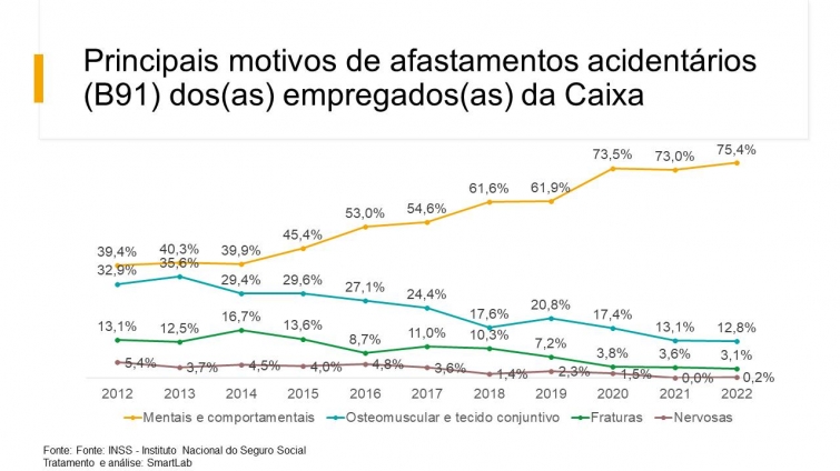 O levantamento citado, realizado pelo Dieese, aponta que, entre os principais motivos de afastamentos acidentários (B91) das empregadas e empregados da Caixa, 75,4% são devido a tratamentos de doenças mentais e comportamentais; 12,8% a doenças osteomusculares e do tecido conjuntivo; 3,1% a fraturas; e 0,2% a problemas nervosos.