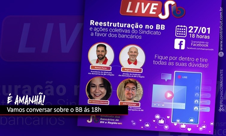 Nesta quarta-feira (27), a reestruturação do Banco do Brasil e a reação dos funcionários serão temas de uma live às 18h. Participam da live Ramon Peres, presidente do Sindicato dos Bancários de Belo Horizonte e Região; Rogério Tavares, diretor do Sindicato dos Bancários de BH e funcionário do BB; a assessora jurídica do Sindicato dos Bancários de BH, Giovana Meireles; e o coordenador nacional da Comissão de Empresa dos Funcionários do Banco do Brasil (CEBB), João Fukunaga.