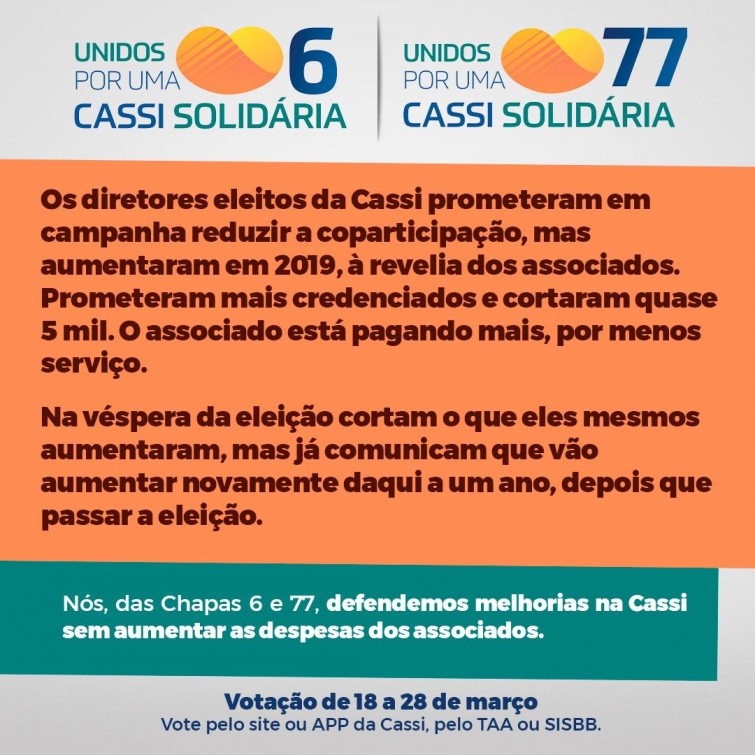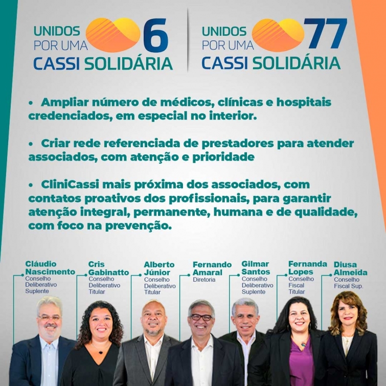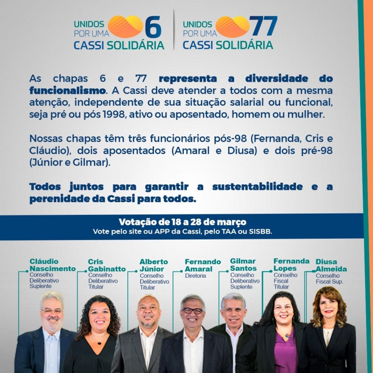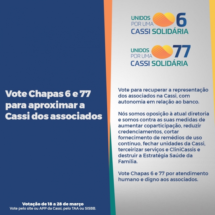 Clique aqui para acessar o site da campanha das Chapas 6 e 77 ?? Unidos por uma Cassi Solidária ?? e conheça todos os candidatos e as propostas das chapas.
