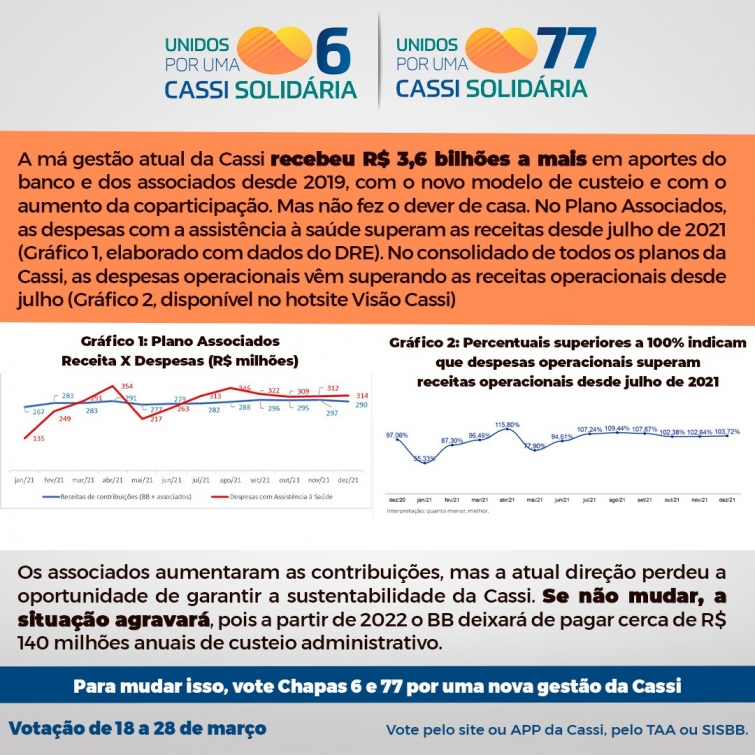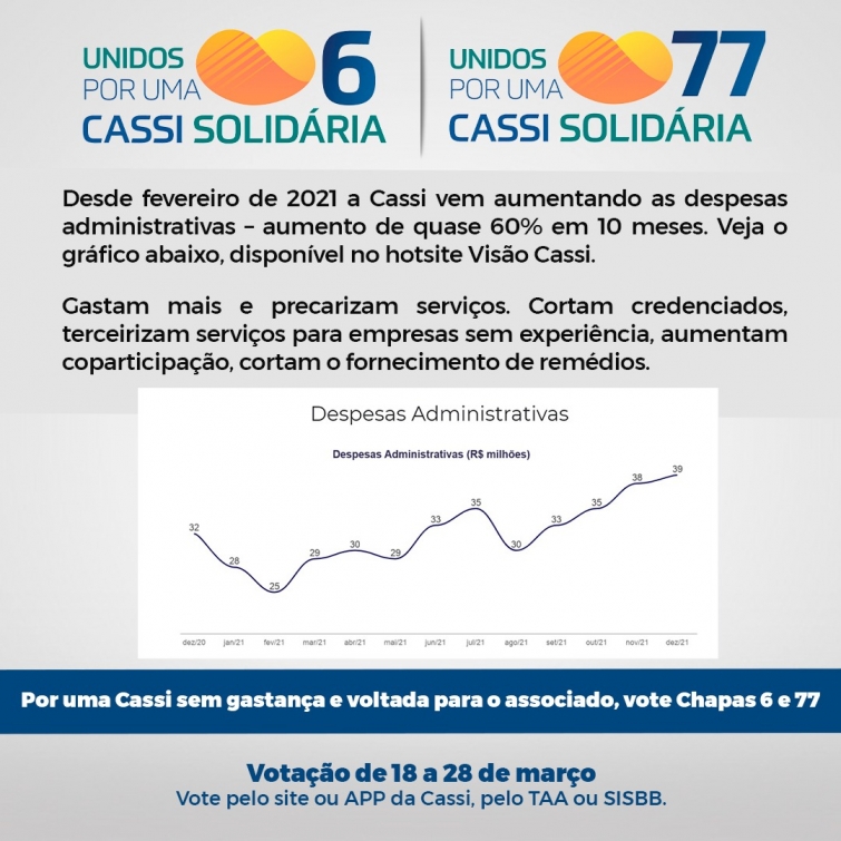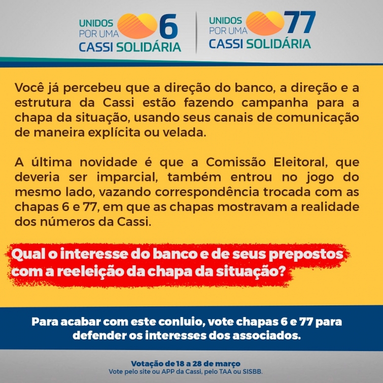 Na atual gestão, a representação do banco e a dos associados se confundem, favorecendo os interesses do banco. ??A força da Cassi está na solidariedade entre os funcionários. Foi construída para garantir o mesmo tratamento a todos conforme a sua necessidade, do escriturário ao presidente do Banco, aos ativos e aposentados e seus dependentes. Sem discriminação?, diz ainda Fernando Amaral, candidato à Diretoria de Risco Populacional. ??A força da união entre os colegas mantém a Cassi e exige que o banco mantenha e amplie seus compromissos com a saúde de todos. Nós, das chapas 6 e 77, pedimos seu apoio para preservar esta história de sucesso e trabalhar pela perenidade da Cassi?, completa.
