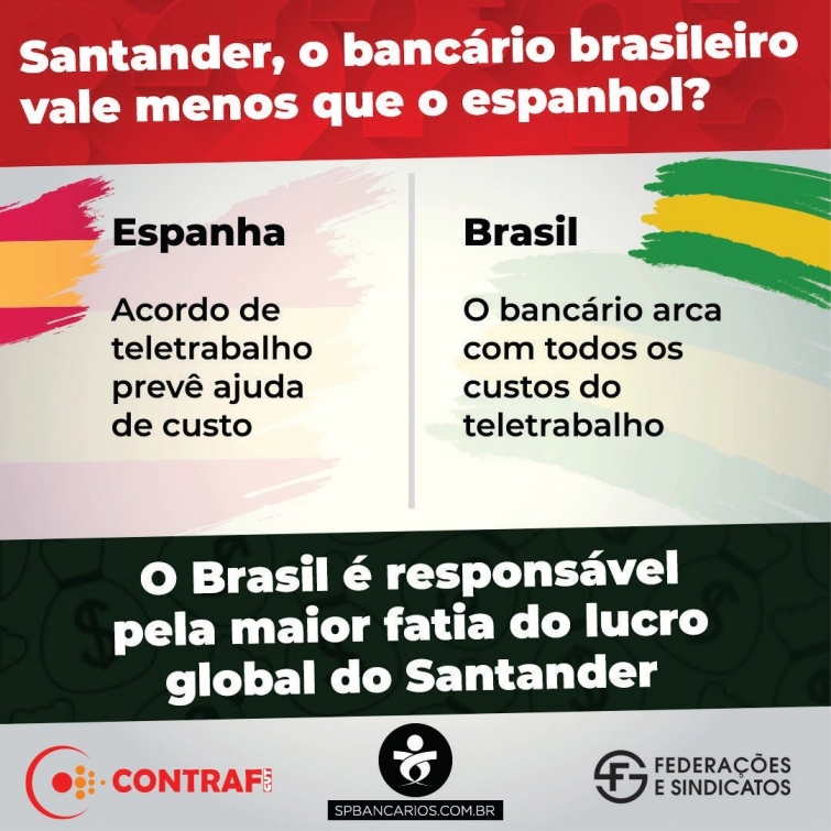 Os bancários da Espanha recém conquistaram um acordo, válido nacionalmente, com garantias para a manutenção dos empregos e que assegura uma série de direitos para os trabalhadores em regime de home office. O acordo é assinado por vários bancos que atuam no país, entre eles o Santander. O mesmo banco que, no Brasil, promove demissões em massa em plena pandemia e recusa-se a negociar com o movimento sindical um acordo de trabalho coletivo prevendo direitos para os funcionários em trabalho remoto (teletrabalho).