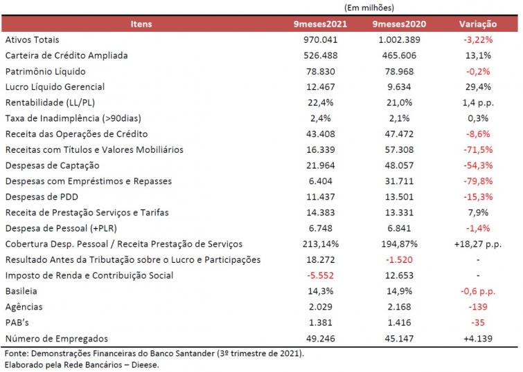 Veja abaixo a tabela resumo do lucro Santander ou, se preferir, leia a íntegra da análise do balanço do Santander nos noves meses de 2021, ambas elaboradas pelo Departamento Intersindical de Estatística e Estudos Socioeconômicos (Dieese).