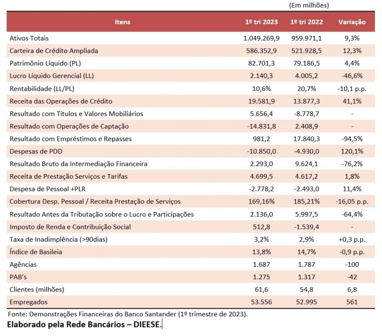 O banco Santander obteve Lucro Líquido Gerencial de R$ 2,14 bilhões no primeiro trimestre de 2023. O valor representa queda de 46,6% em relação ao mesmo período do ano passado e reflete o crescimento de provisões para créditos de liquidação duvidosa (PDD), que mais que dobraram em 12 meses (+120,1%), totalizando R$ 10,85 bilhões no trimestre. Em sumário de análise dos destaques do balanço do Santander, o Departamento Intersindical de Estatística e Estudos Socioeconômicos (Dieese) explica que o aumento da PDD se deu, em grande medida, por conta do caso Americanas S.A., que, em janeiro, divulgou rombo bilionário, sendo o Santander um dos credores da empresa mais afetados.