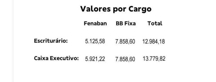 No BB, o cálculo do pagamento da PLR leva em conta o módulo Fenaban e o módulo BB. Pelo módulo Fenaban, o funcionário recebe 45% do salário paradigma definido no acordo, acrescido de parcela fixa. No módulo BB existe a distribuição linear de 4% do lucro do banco entre os funcionários, além da parcela variável. Confira os valores na tabela abaixo.